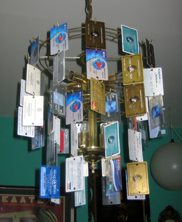 I have been collecting those fake credit cards that come in junk mail for at least three years now. With some help from my friends, I have amassed around 100 of them as of this post. To date I have used them to spice up the chandelier in the living room, but I elected to pull a few ‘cards’ to make this nifty lamp shade.