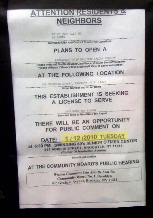 The funny thing is I don’t recall seeing a notice for a liquor license hearing— scheduled for January 12, 2010— when I walked by. Your commentary suggests this document is a new addition.